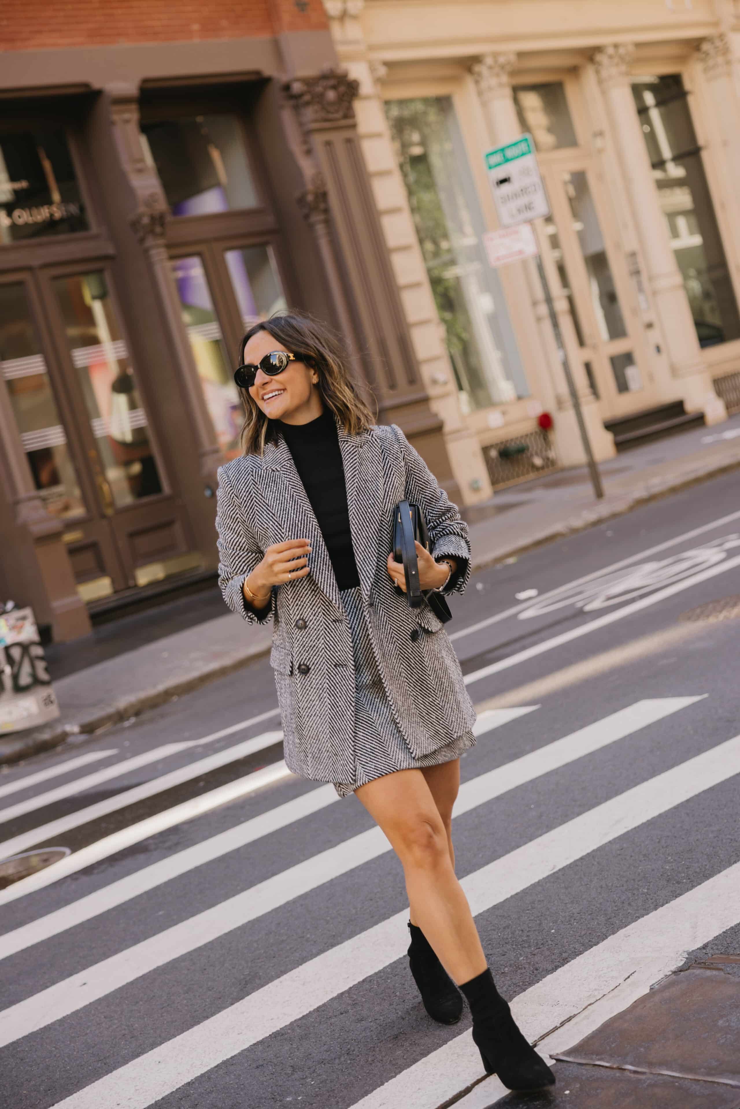One of my favorite ways to elevate a black turtleneck is with a blazer and matching skirt. It’s polished and chic, and can easily be paired with a pair of tights in the colder months.