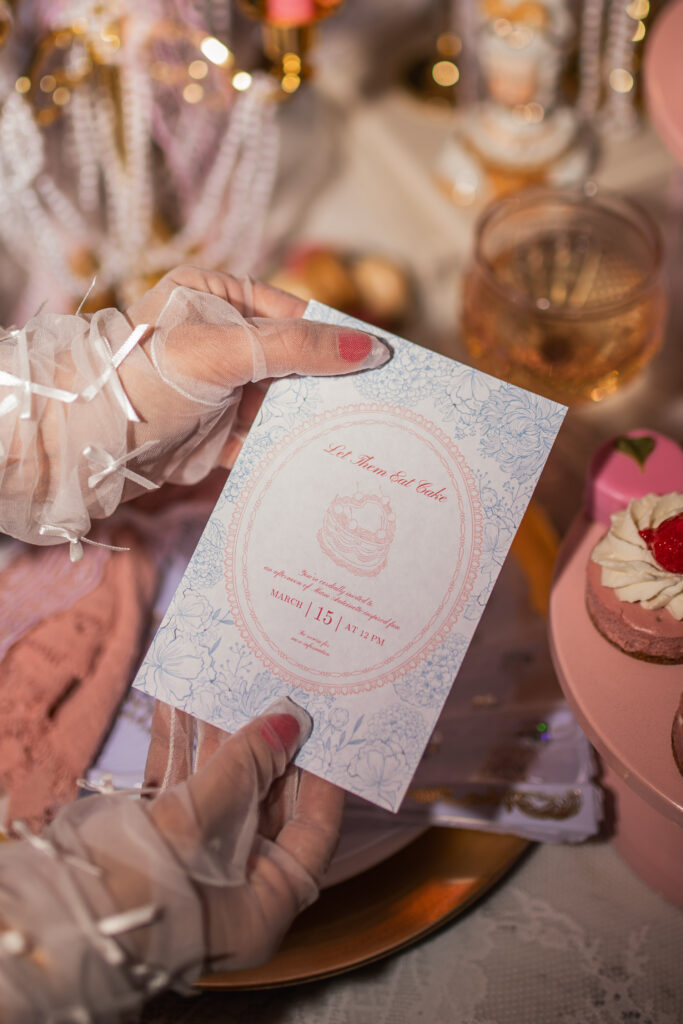 Once you’ve decided on a date, location, and the overall feel of your Marie Antoinette team party, it’s time to send some invitations! For a special occasion get togethers, I love sending either a digital or paper invitations to bring the theme to life.