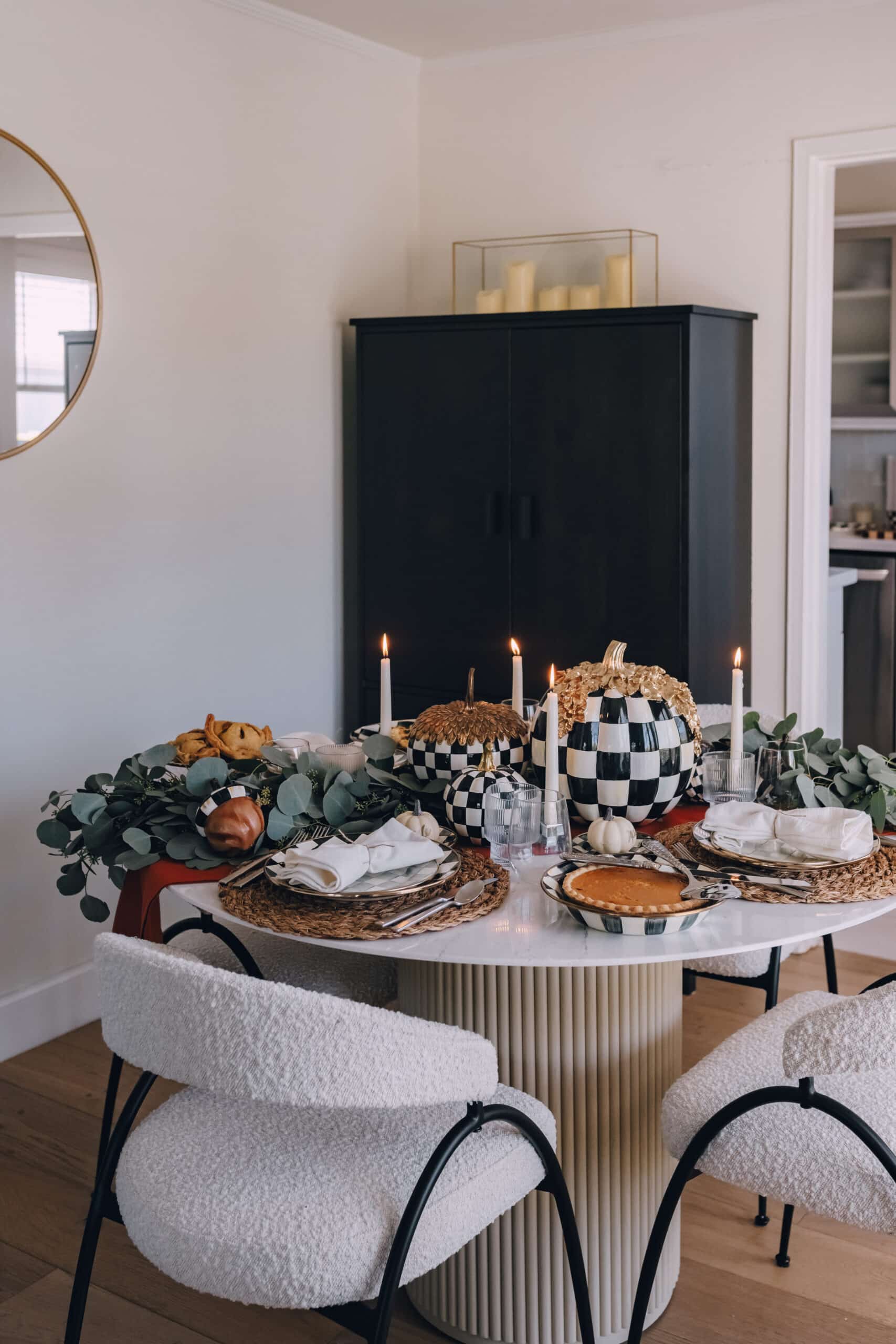 Thanksgiving centerpieces don’t have to be difficult. In fact, there are a few affordable centerpiece items that I stick to every single year: greenery, candles, and some kind of seasonal produce like mini pumpkins or pears.