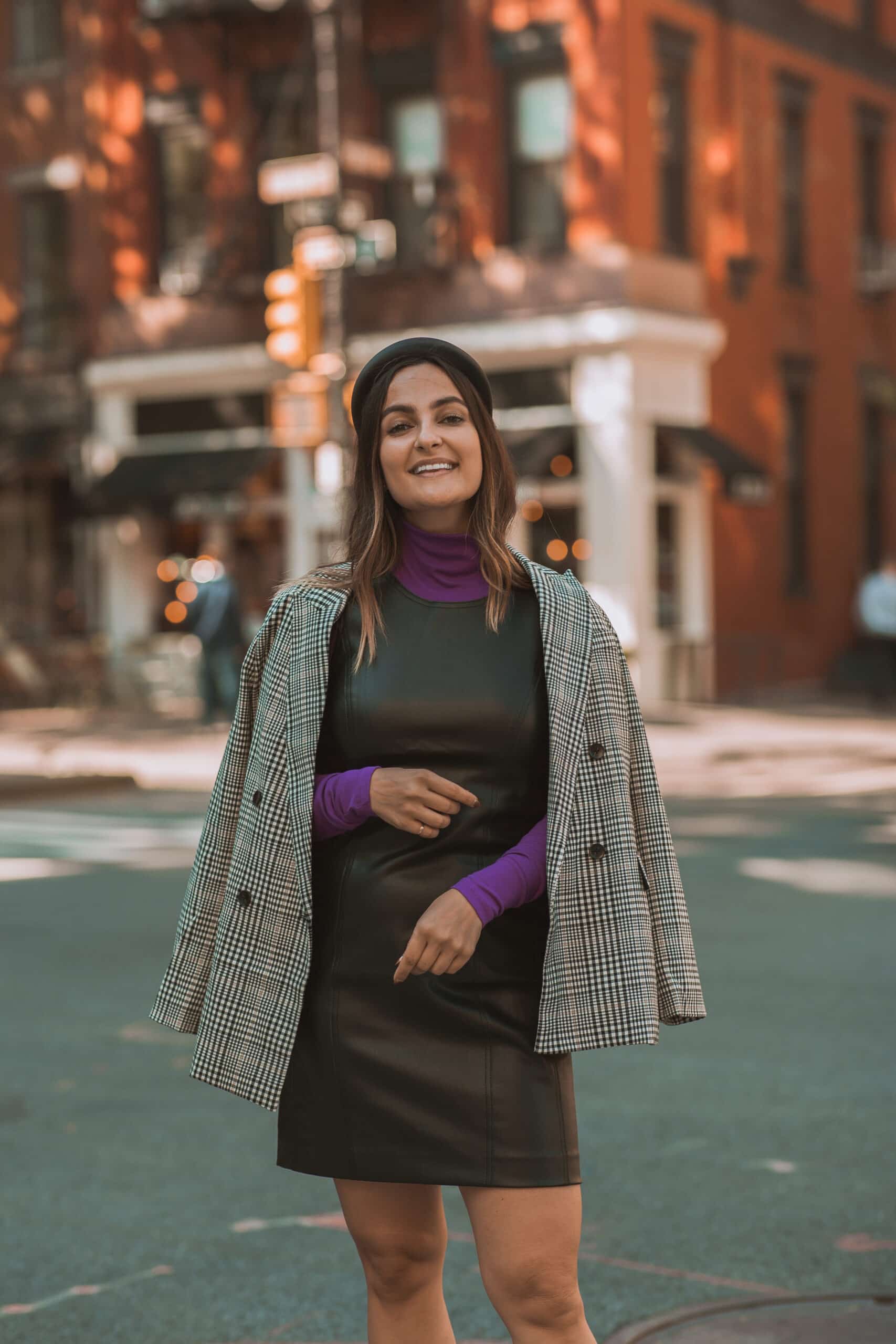 The trick when you style a blazer with something short is to make sure you nail the proportions. You want the bottom of your plaid blazer to fall almost in line with the hem of whatever you’re wearing on the bottom. If you’re wearing your blazer over a short dress, you’ll want it to hit at the hip.