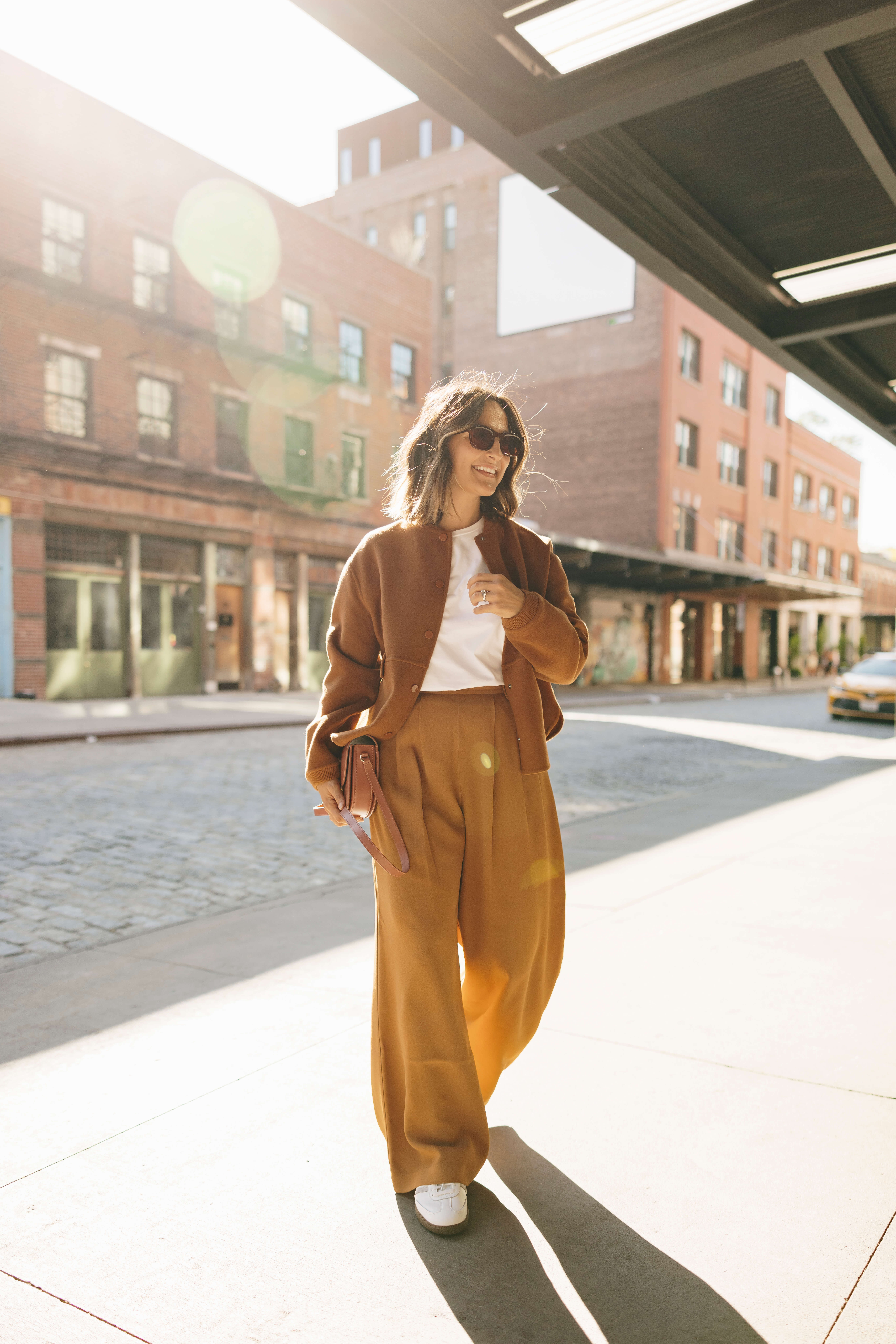 For a sportier vibe, try pairing your wide leg trousers with a the same color bomber jacket for an instant cool girl look. A tomboy silhouette like a bomber jacket mixed with polished trousers makes this effortless and modern.