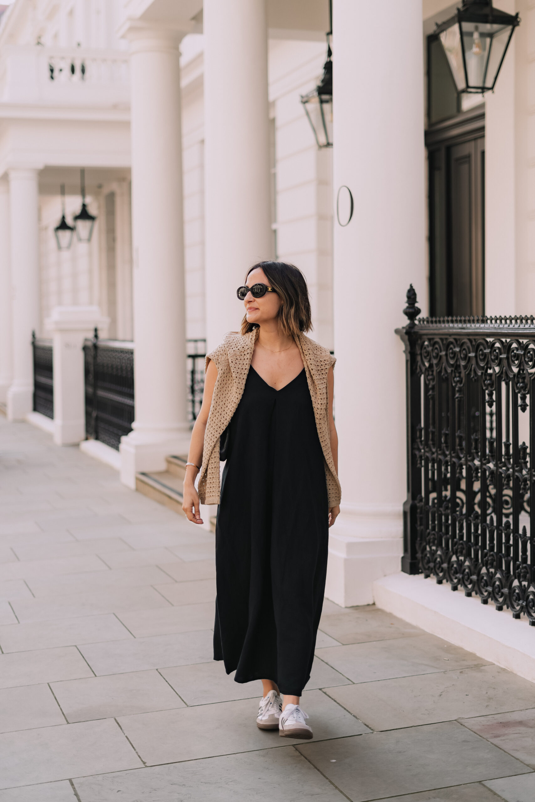 You can never go wrong with a black dress and classic neutrals. It’s the kind of combo that feels pulled together but is casual enough to wear every day. Pair an easy, flowy black dress with flat leather sandals and tie a lightweight knit around your shoulders as a third piece to finish the look. For a bag, you can either go with a black bag like I did here, or wear a woven clutch to add texture. It’s an easy outfit to wear on vacation, to lunch, or while exploring your favorite city.