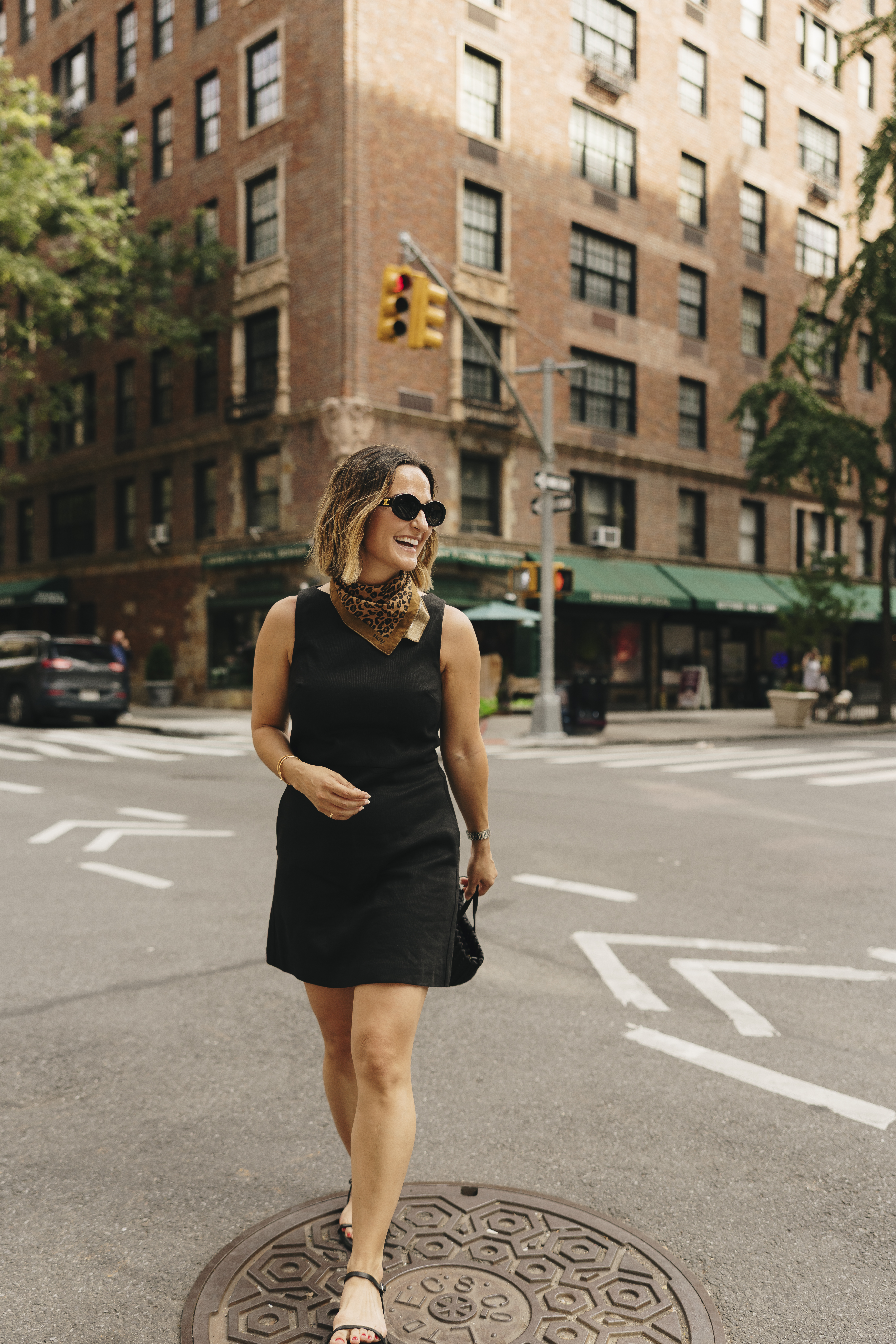A black linen mini dress is my go-to for hot summer days when I still want to look put together. It’s lightweight, breathable, and effortlessly stylish. I paired it with simple sandals to keep things casual, then added a leopard print accessory for just the right amount of flair. The bold print breaks up the all-black look and gives it that little extra something without going overboard.