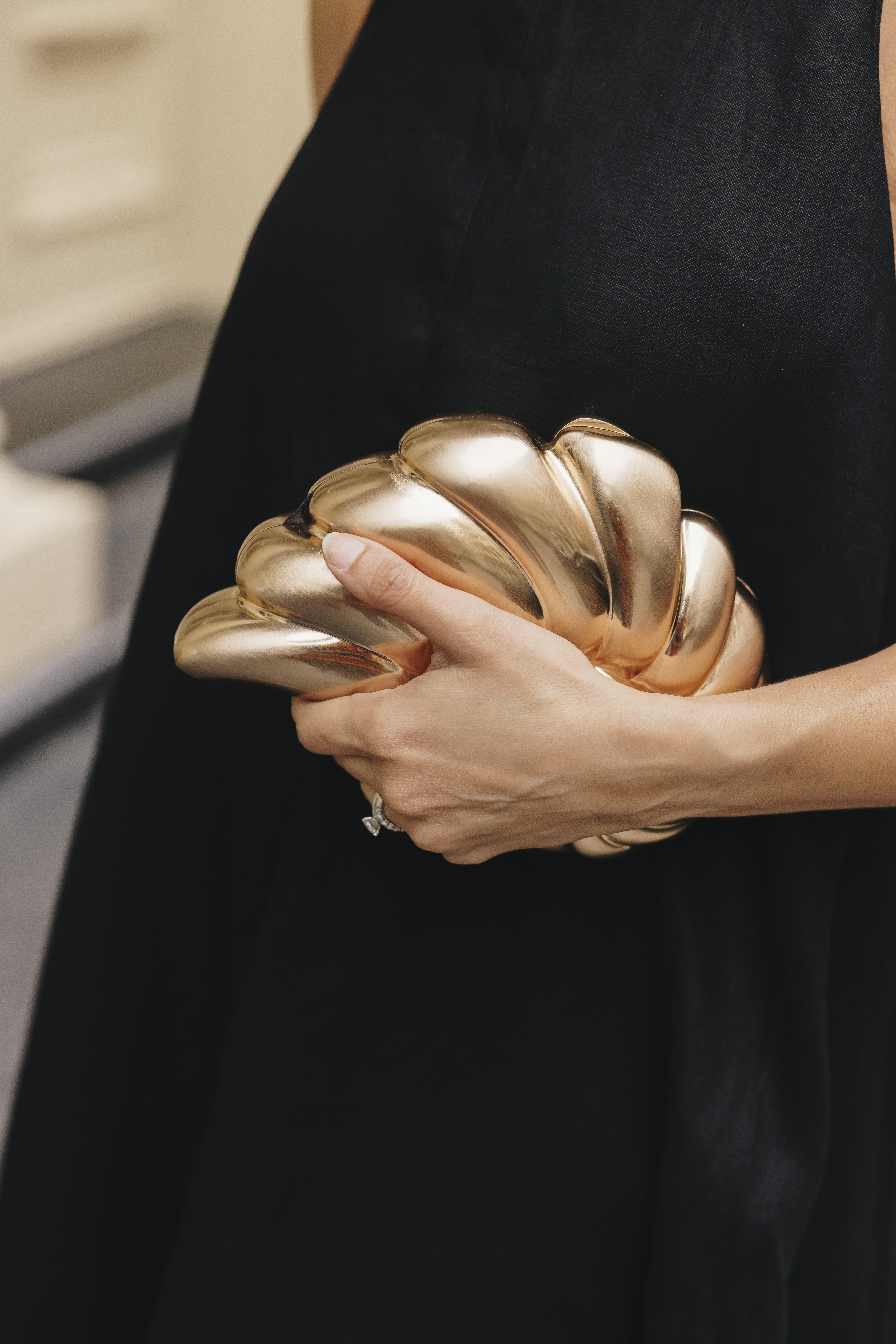 Black Dress | Black Sandals | Gold Necklace | Shell Clutch (similar)
