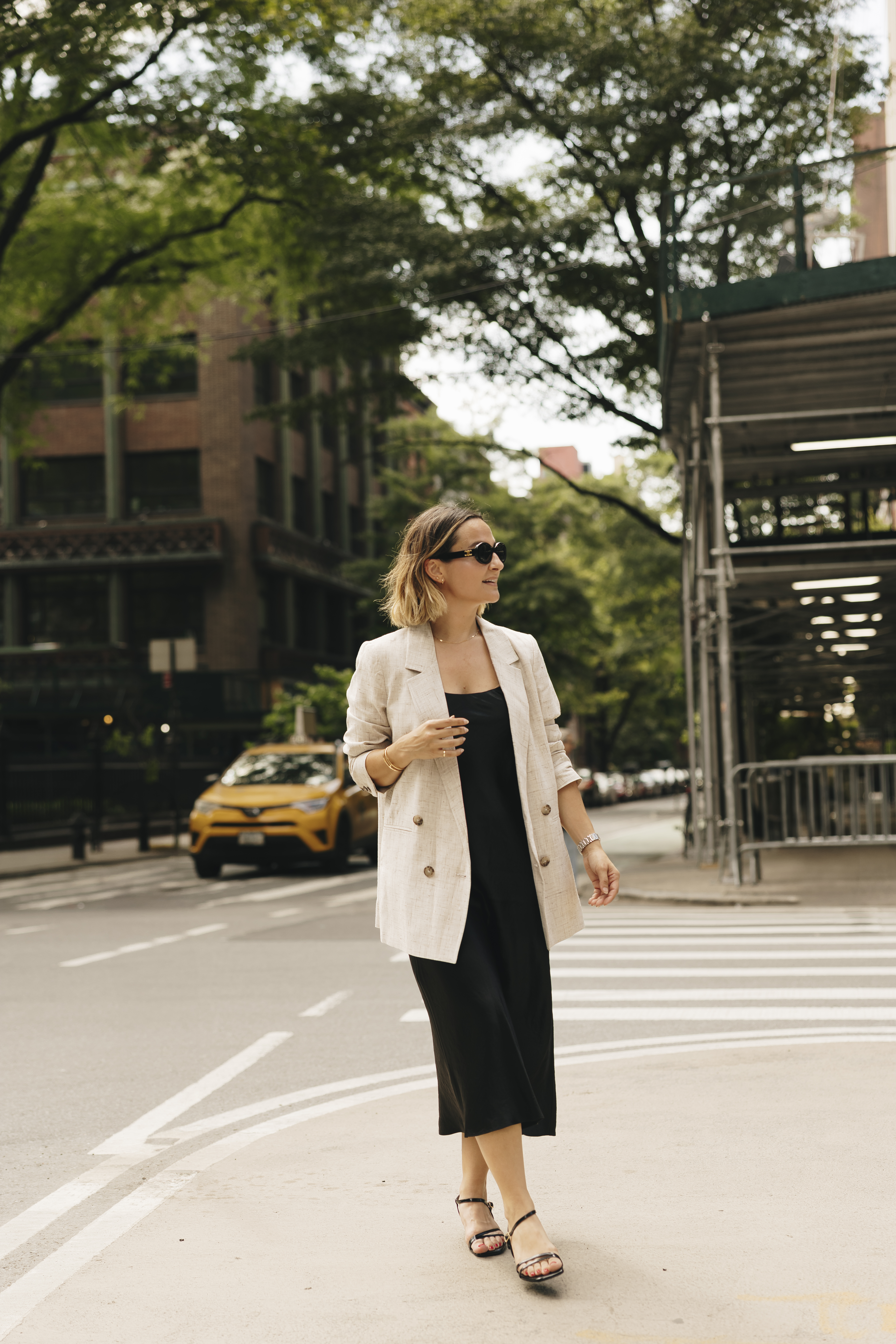For those summer days that turn into breezy nights, I love layering a lightweight blazer over a classic black slip dress. It instantly makes the look feel more intentional and elevated, without adding too much warmth. Whether you’re heading to a patio dinner or a casual work meeting, this combo strikes that perfect balance between relaxed and refined. Just add strappy sandals or sleek sneakers to finish it off.