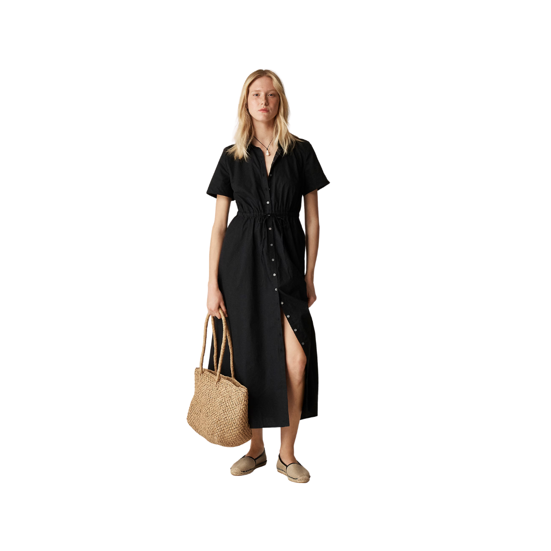 If you’re heading somewhere a little fancier but still want to keep things summer-appropriate, this look is for you. A black linen maxi dress is the perfect blank canvas. Pair it with strappy black sandals to keep things sleek, then add a gold clutch for a statement. It’s simple, but elevated, and proves that you don’t need bold colors to make a statement.