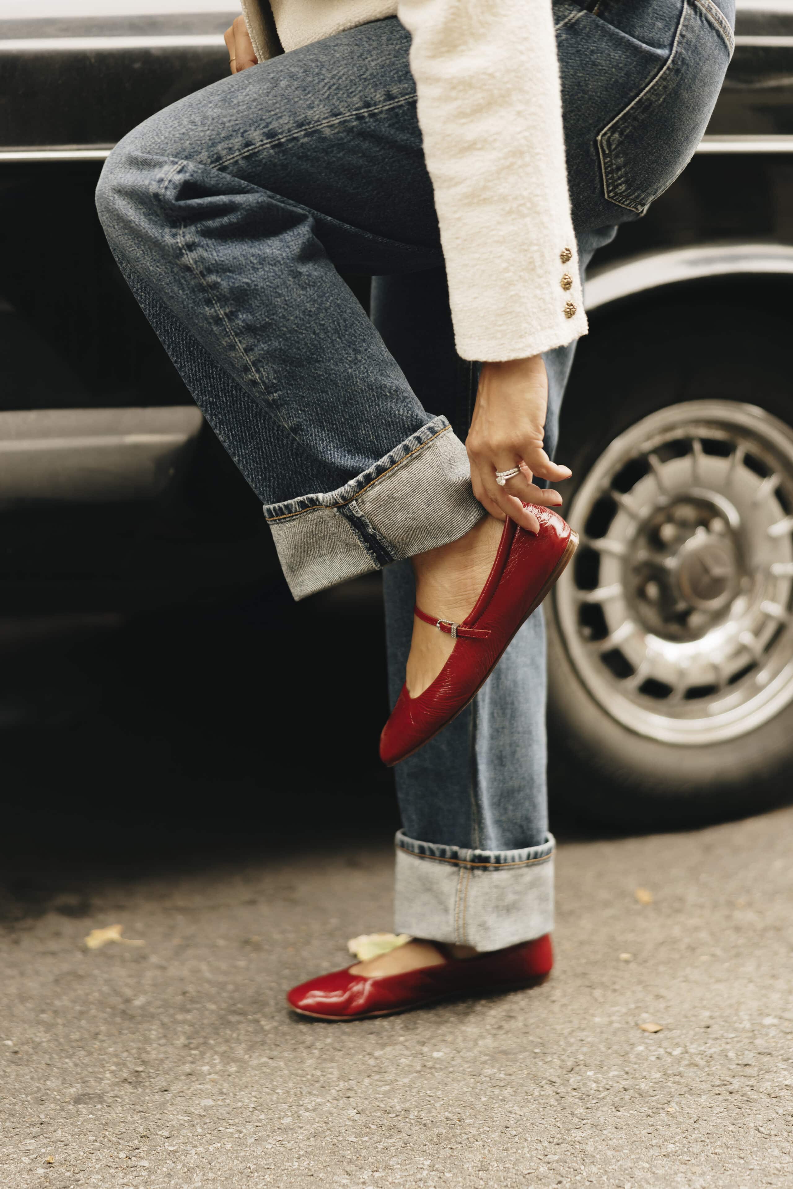 To prevent ballet shoes from feeling too matronly, offset them with a slouchy pair of jeans or something current and unexpected, like barrel pants. Or, try ballet flats in a fun, trending color like this red pair.