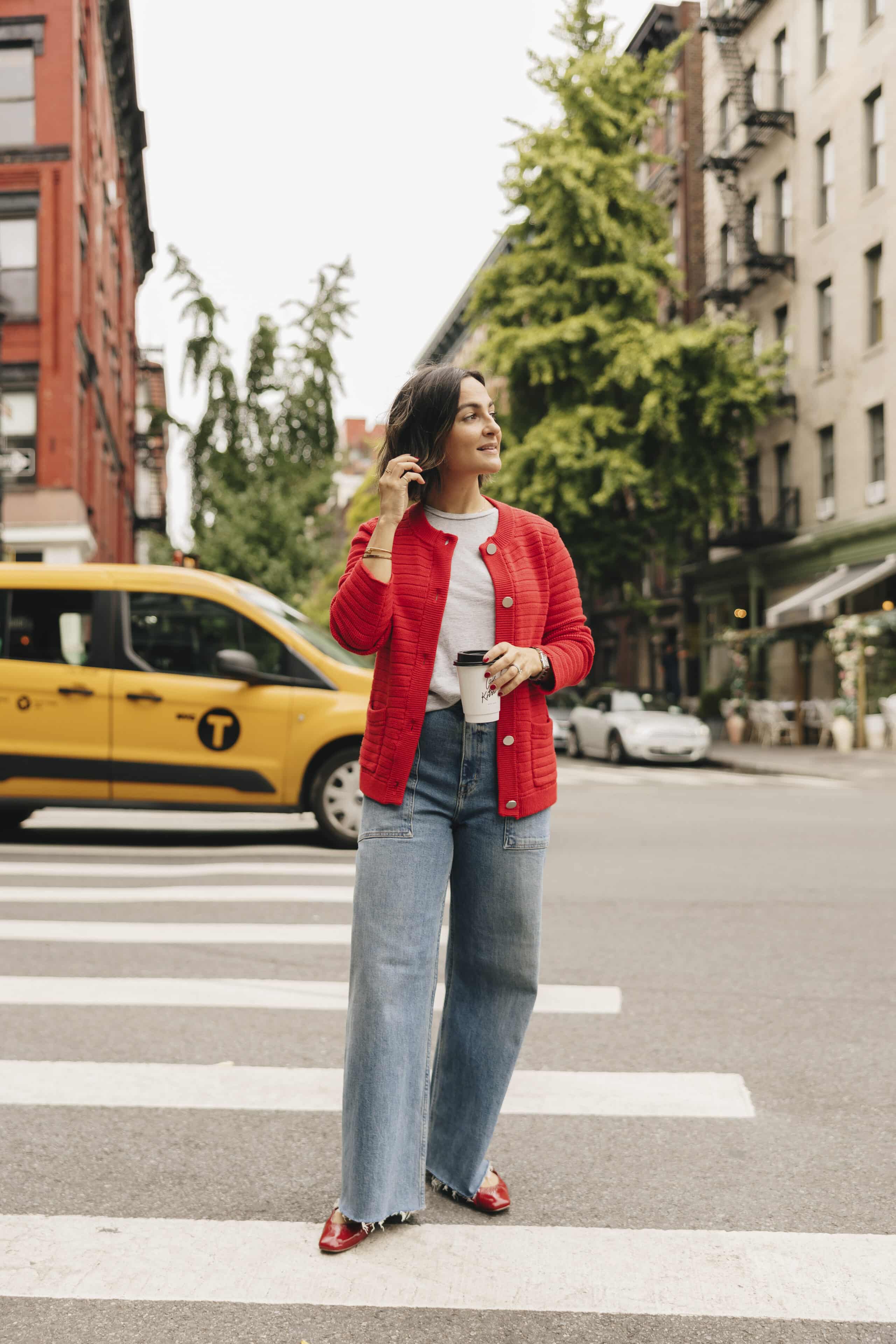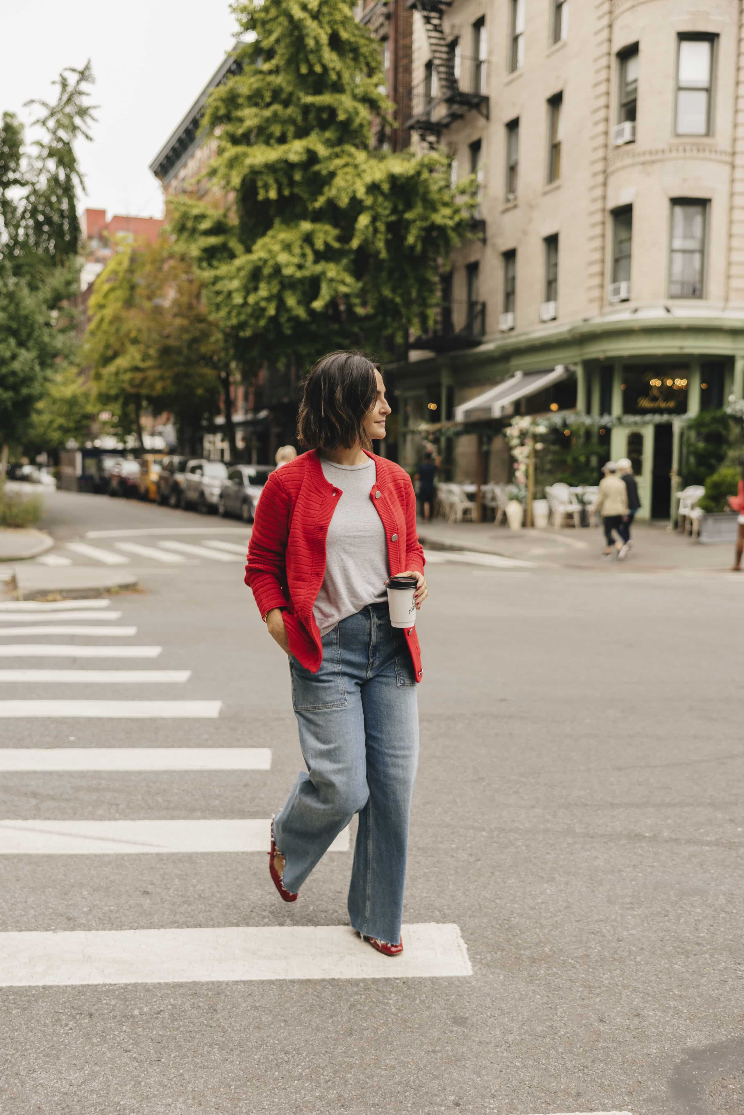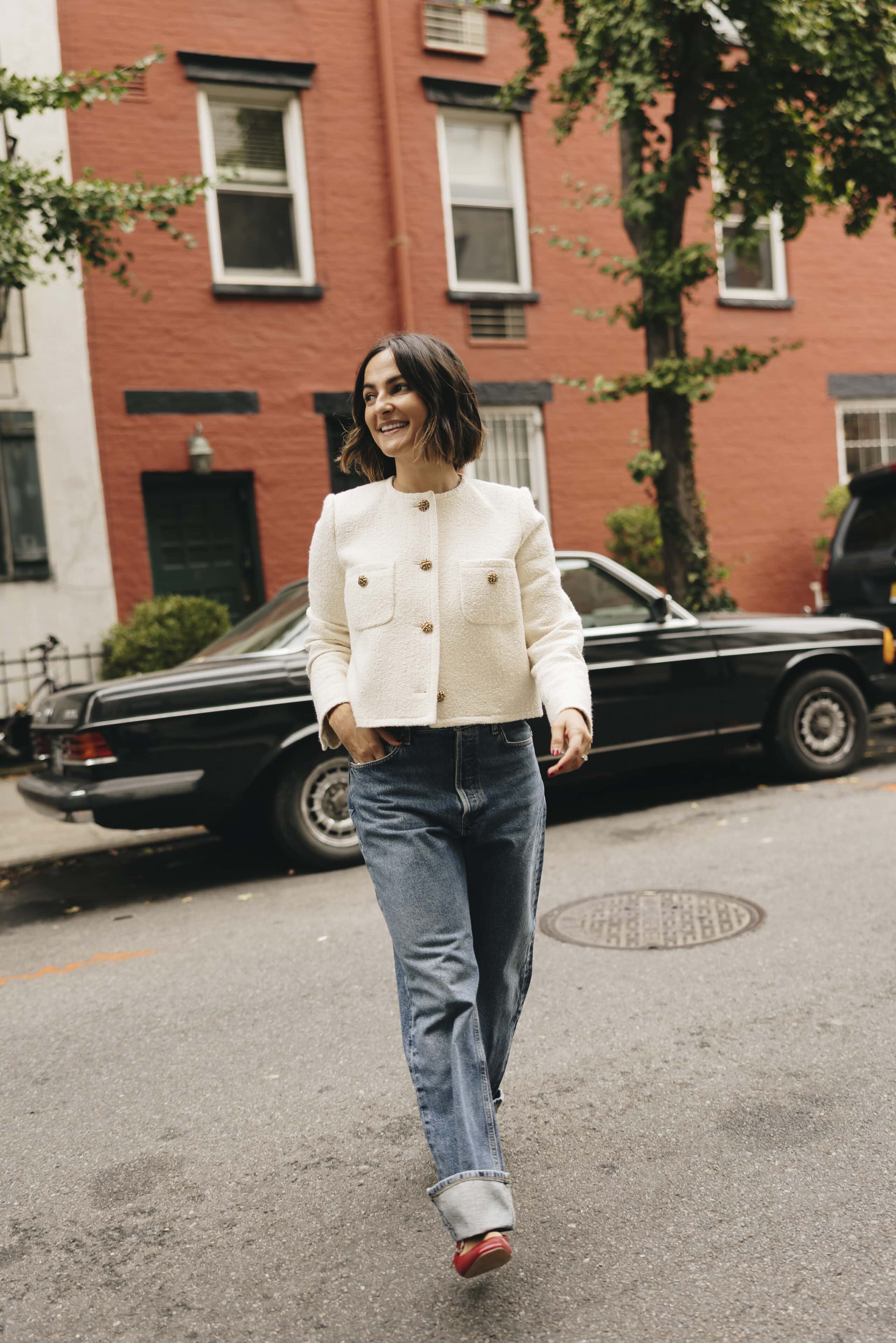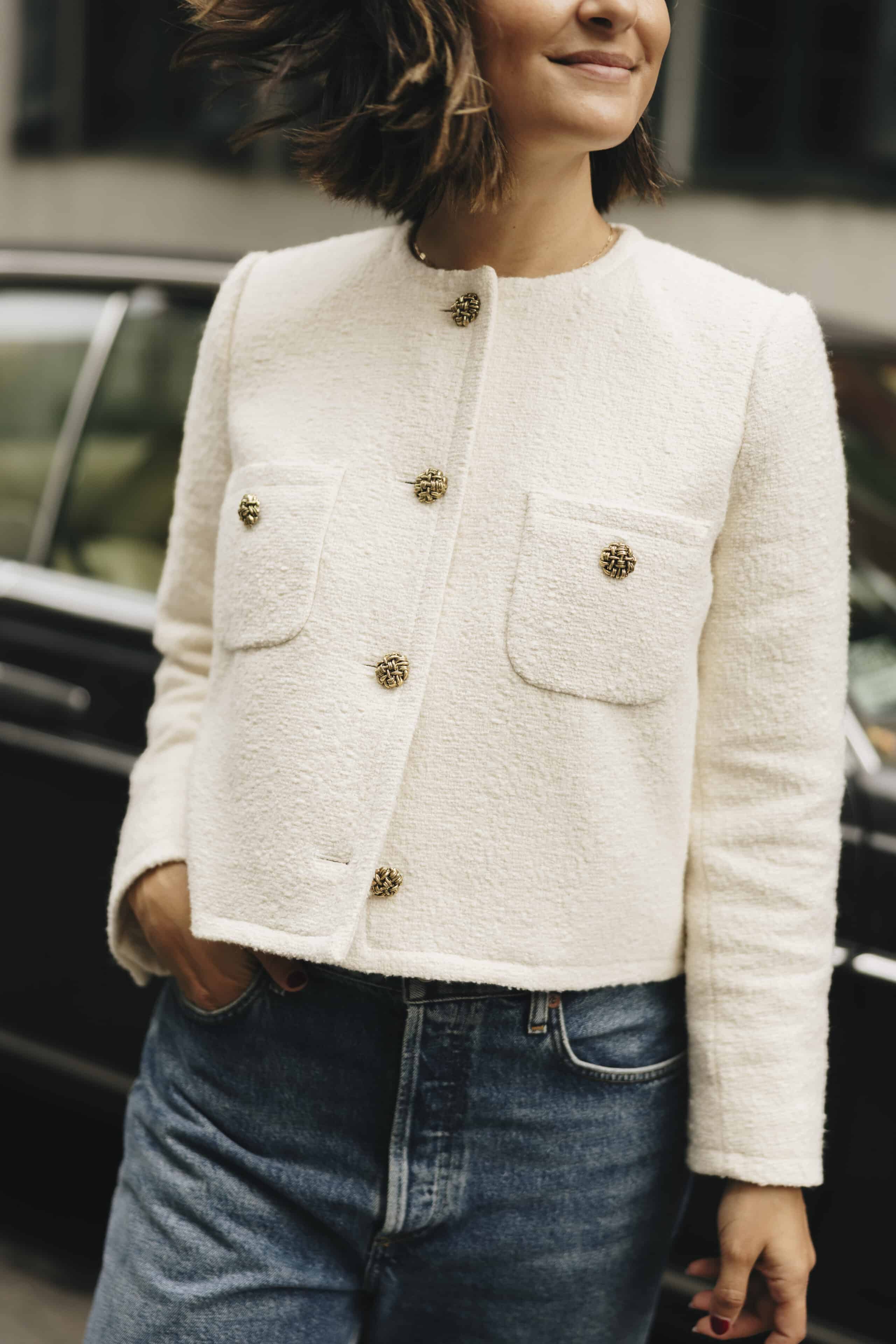 To give a ladylike jacket a modern twist, pair yours with of-the-moment wide leg jeans instead of the traditional matching skirt.