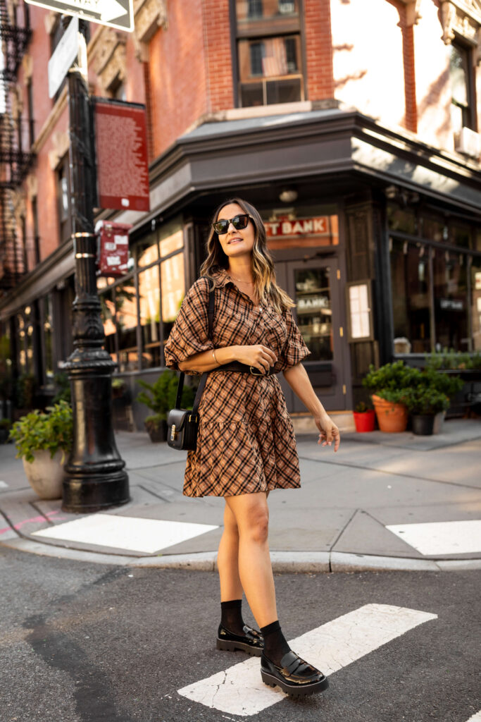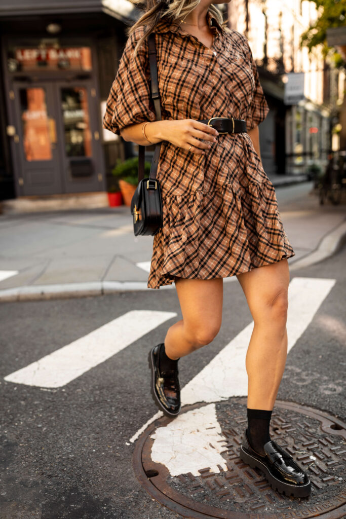 You don’t have to just stick with jeans when styling a chunky loafer outfit. Try a fun mini dress and some sheer black ankle socks.