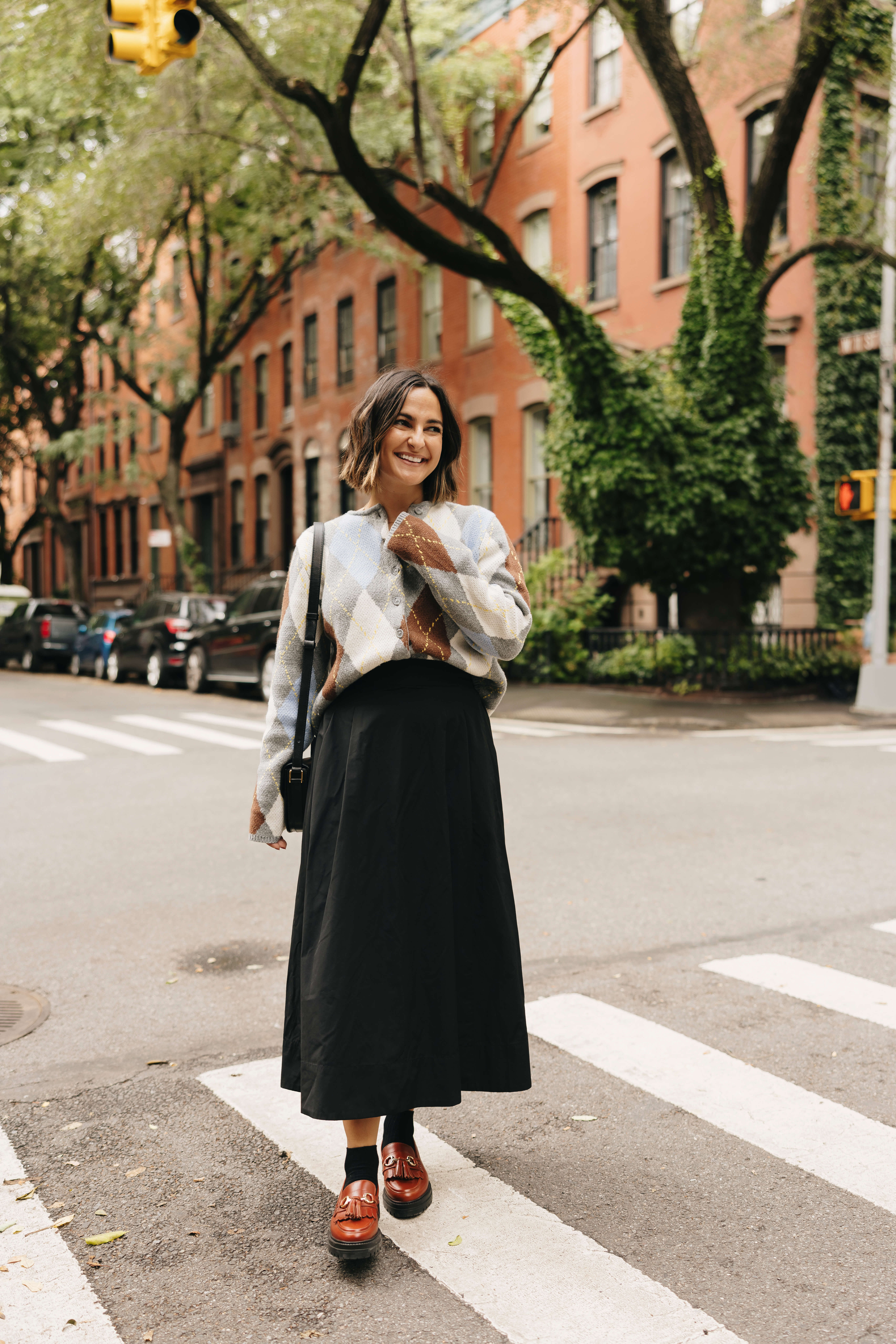 The most common chunky loafer out there is black, but that doesn’t mean you can’t lean into the warm tones of fall! I love how she offset her black loafers with a brown sweater and plaid skirt. Or, go all in and snag a pair of brown loafers.