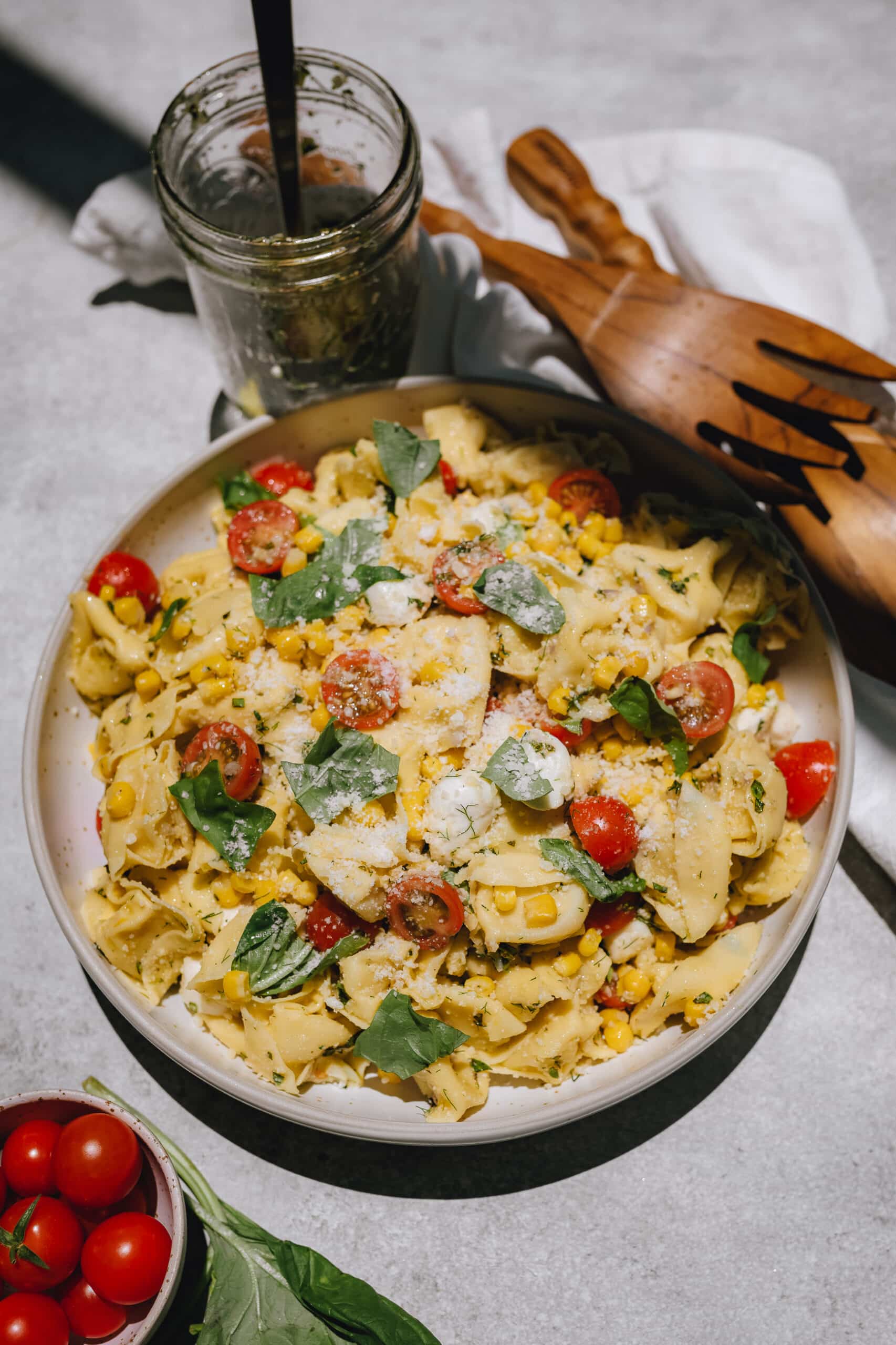 In a large bowl, add the cooked tortellini, cherry tomatoes, corn, and mozzarella. Then, add in the vinaigrette, gently stirring with a large spoon. Pour in a large handful of grated parmesan cheese and some hand-torn basil leaves and stir a few more times.