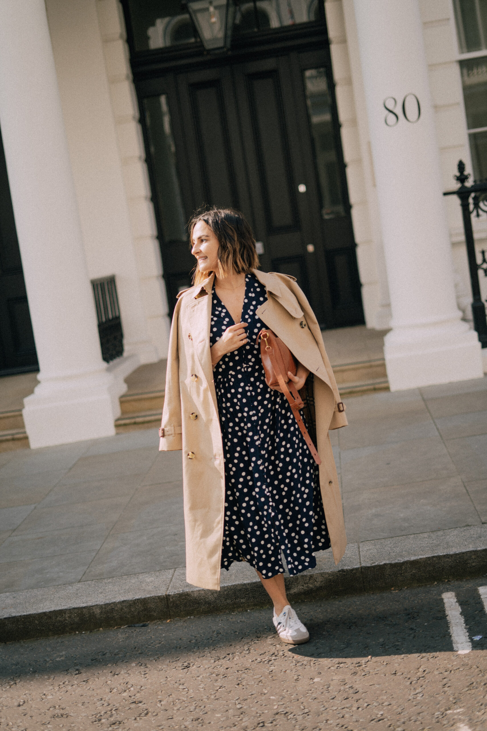 A trench coat is iconic, effortless, and easy. Don’t overthink your clothing or accessories; keep them simple, too.